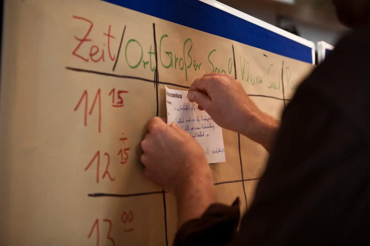 Zu Beginn des Camps organisieren die Mitarbeiter gemeinsam die Tagesagenda. Und das geht so: Du gehst auf die Bühne und stellst dich und dein Thema kurz dem Plenum vor. Per Handzeichen gibt dir das Publikum Rückmeldung, wie viel Interesse dein Sessionvorschlag (eine solche Session dauert in der Regel 45-60 Minuten) in der Runde findet. Je nach angezeigtem Feedback erhältst du einen entsprechend großen oder kleinen Workshopraum zugeteilt. Alle Sessionvorschläge und -verteilung auf die Räume werden vom BarCamp Moderator auf einer Metaplan-Pinnwand festgehalten und so entsteht in kurzer Zeit die Agenda.