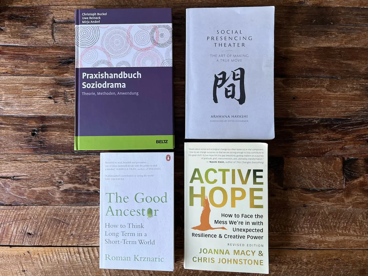 Das hier vorgestellte Konzept besteht einer Bricolage der drei Entkoppelungen nach Otto Scharme (Theory U), dessen Übersetzung im 4D-Mapping des Social Presencing Theaters (SPT), einen Auszug aus dem Seed Dance (SPT) und die Arbeit mit Rollen aus dem Soziodrama. Wer tiefer in drei Entkopplungen (Three Divides), das 4D-Mapping oder den Seed Dance eintauchen will, sollte sich das Buch “Social Presencing Theater” von Arawana Hayashi anschauen. Für die Arbeit mit dem Soziodrama, möchte ich das “Praxishandbuch Soziodrama” von Mirja Anderl, Christoph Buckel und Uwe Reineck empfehlen.