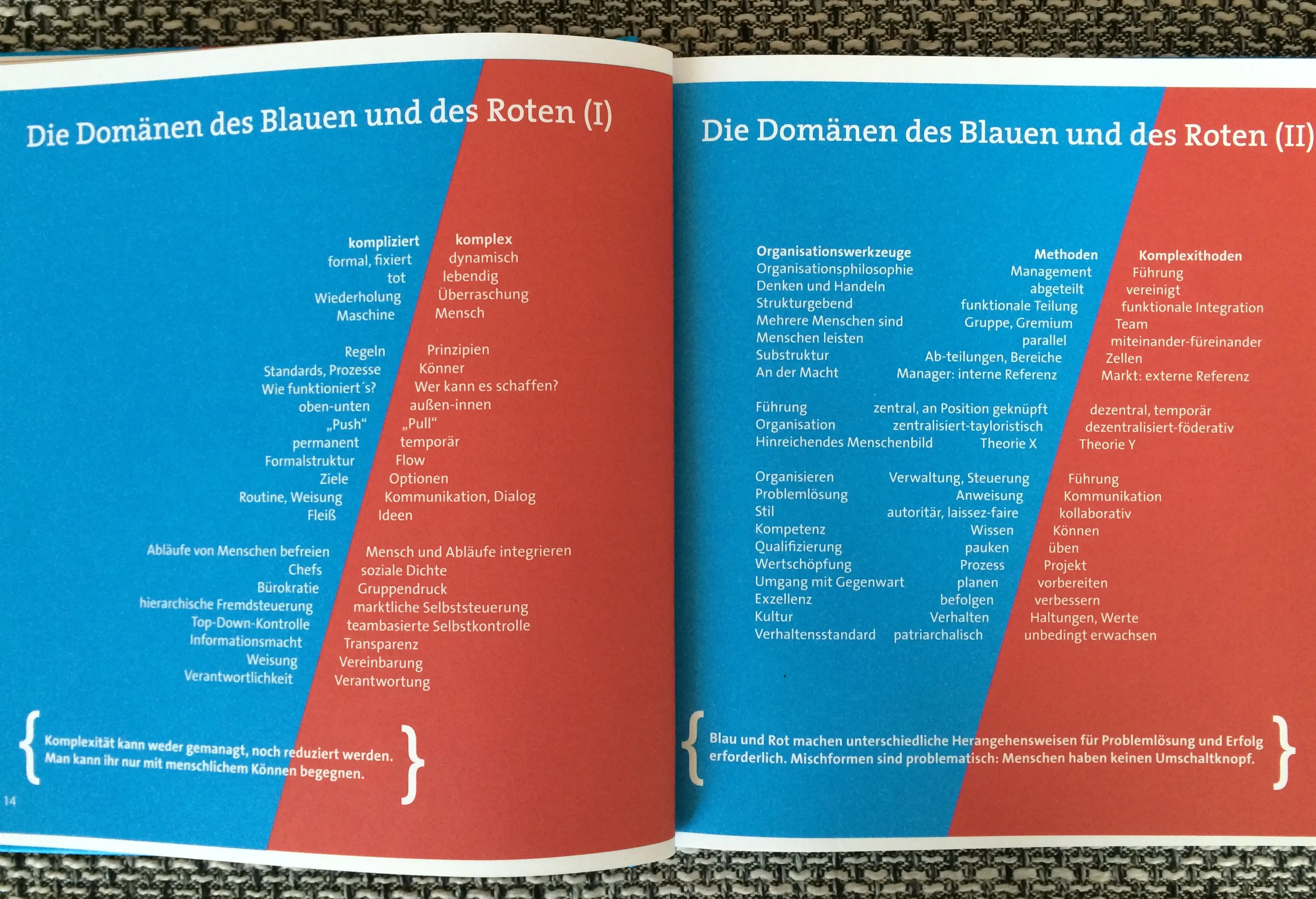 Entsprechend sind neue Ansätze für Strukturen und Prozesse, Management und Führung gefragt. In Komplexithoden sprechen die Autoren von der alten blauen Domäne und der neuen roten. Blau steht für kompliziert.