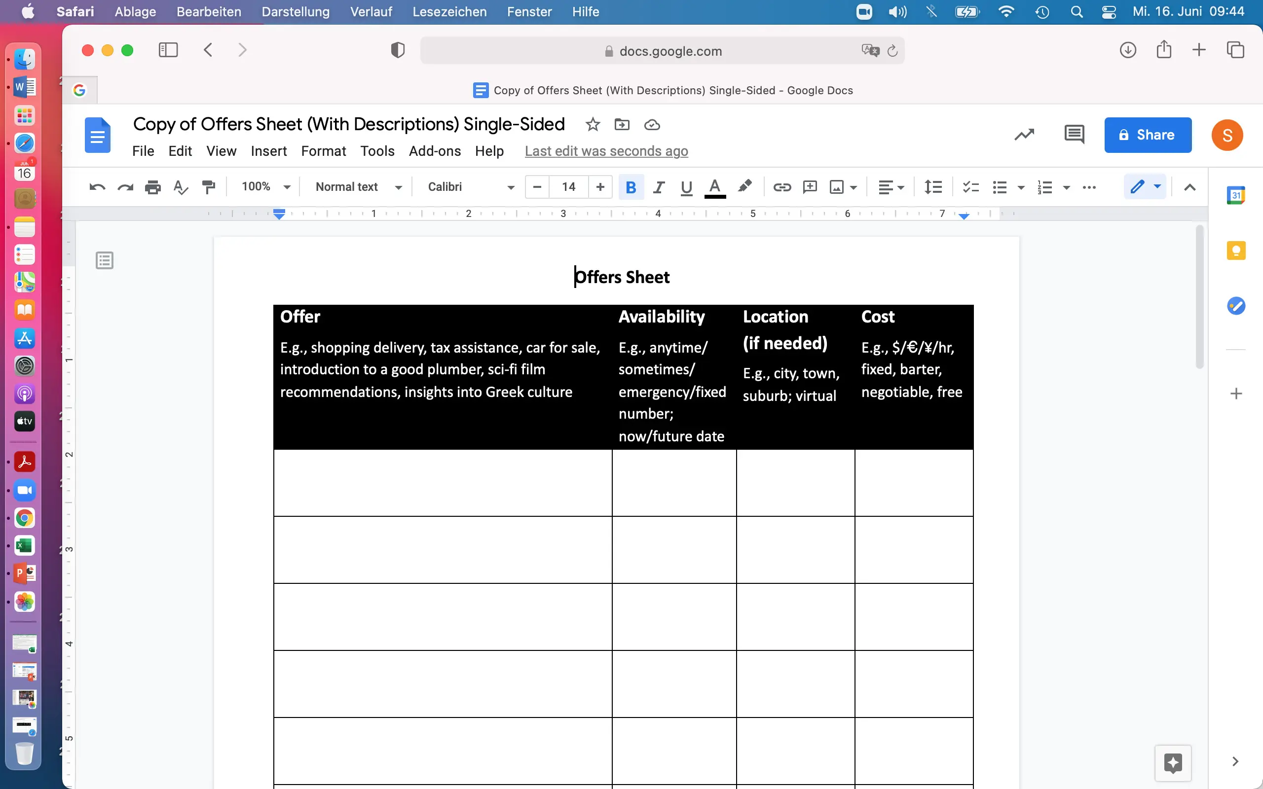 Im Offers Market oder Markt des Gebens wurde ein Angebote-Template als Google Doc via Screenshare geteilt. Alle Teilnehmer*innen wurden gebeten auf einem A4 Papier die folgenden Spalten zu kreieren: Name, Angebot, Verfügbarkeit, Ort, Kosten.