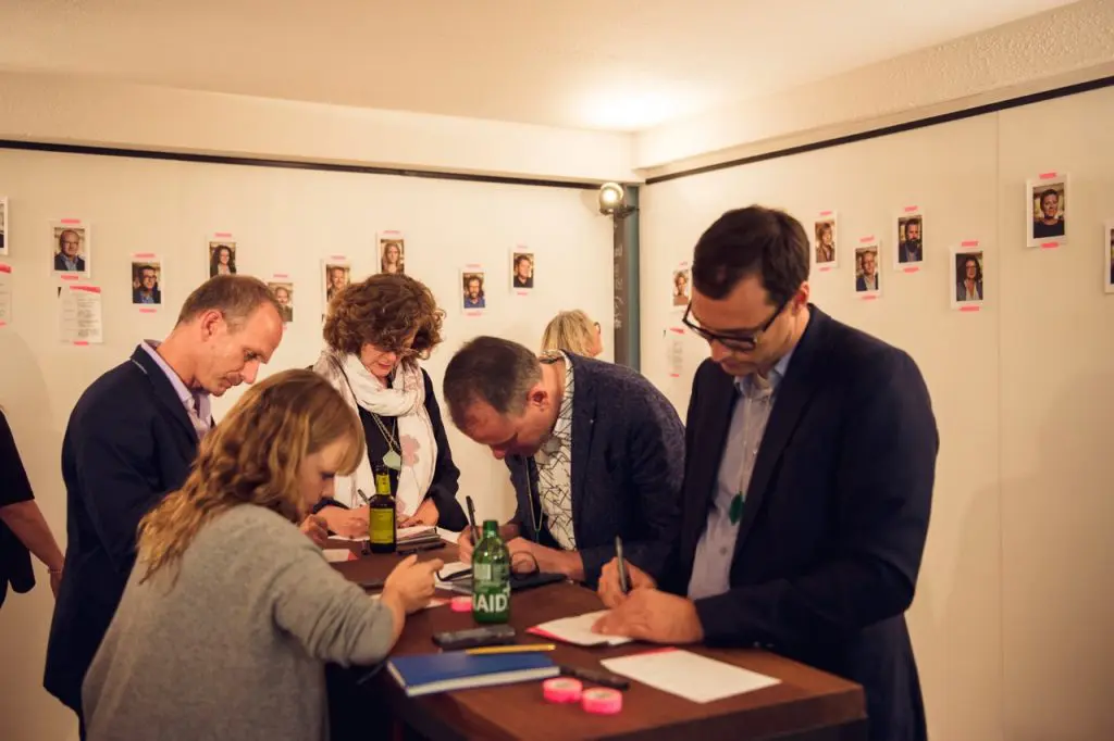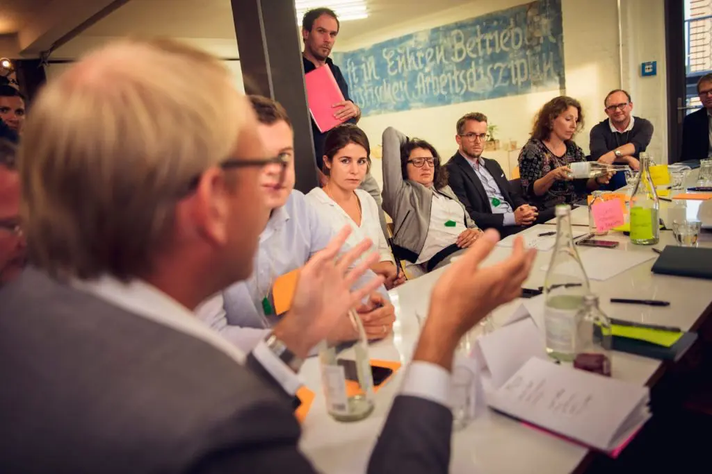 Um die Initiative für Networking und Austausch nicht allein den TeilnehmerInnen zu überlassen, haben wir ein begleitetes Networking als Element in das Format eingebaut. Hierfür haben wir zunächst bei der Ankunft von jeder Teilnehmerin und jedem Teilnehmer ein Foto gemacht, diese an einer zentralen Wand gesammelt und durch ein kleines Template ergänzt, durch das die TeilnehmerInnen mehr voneinander erfahren konnten. Auf dieses leicht strukturierte Networking-Element folgte ein informelles Dinner, bei dem sich alle TeilnehmerInnen ganz frei austauschen und neu gemachte Bekanntschaften weiter vertiefen konnte, die Eindrücke vom Tag in entspannter Atmosphäre austauschen konnten.